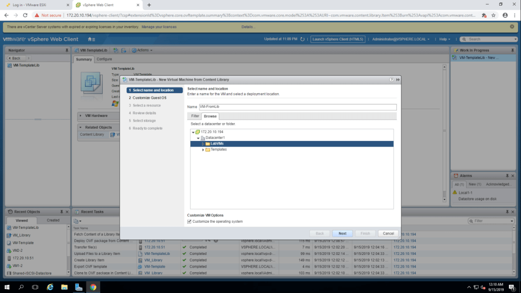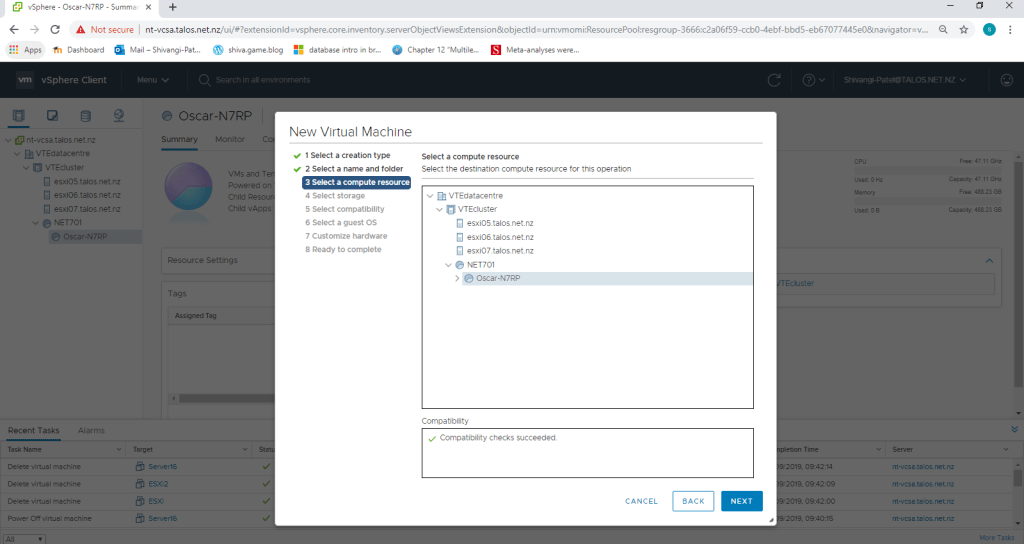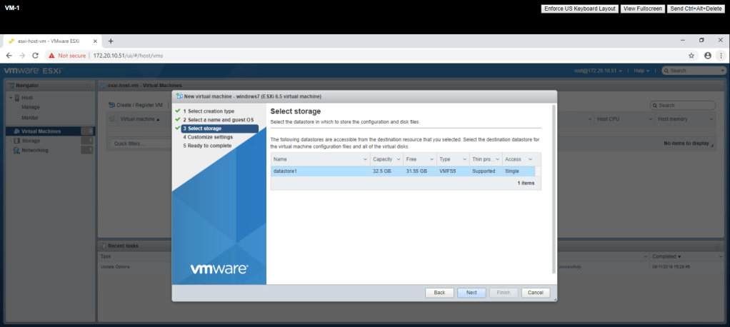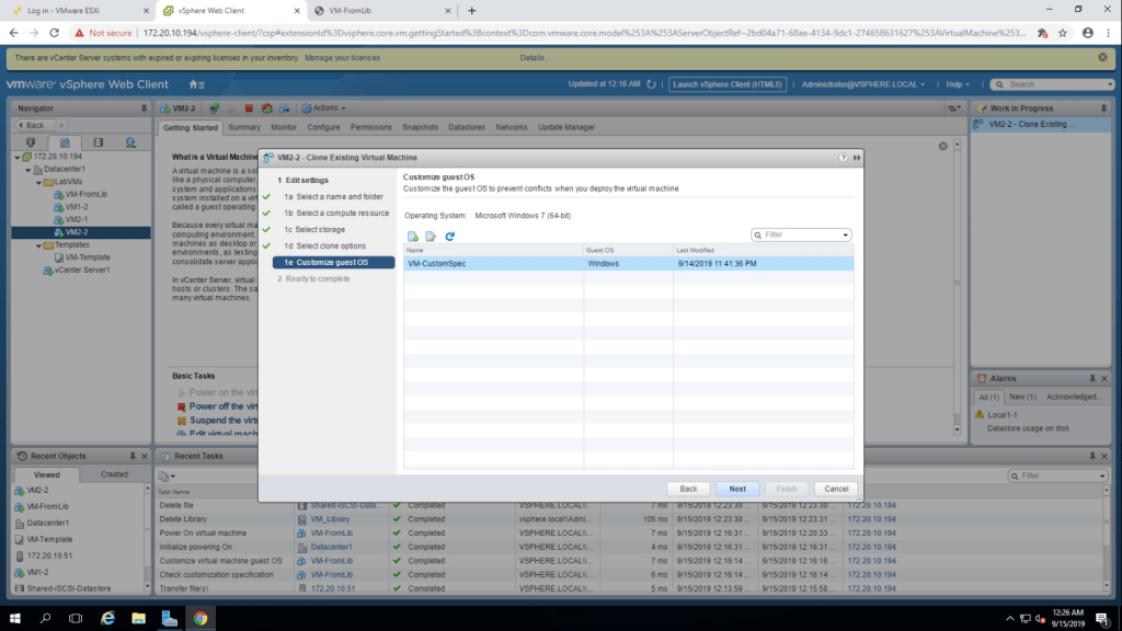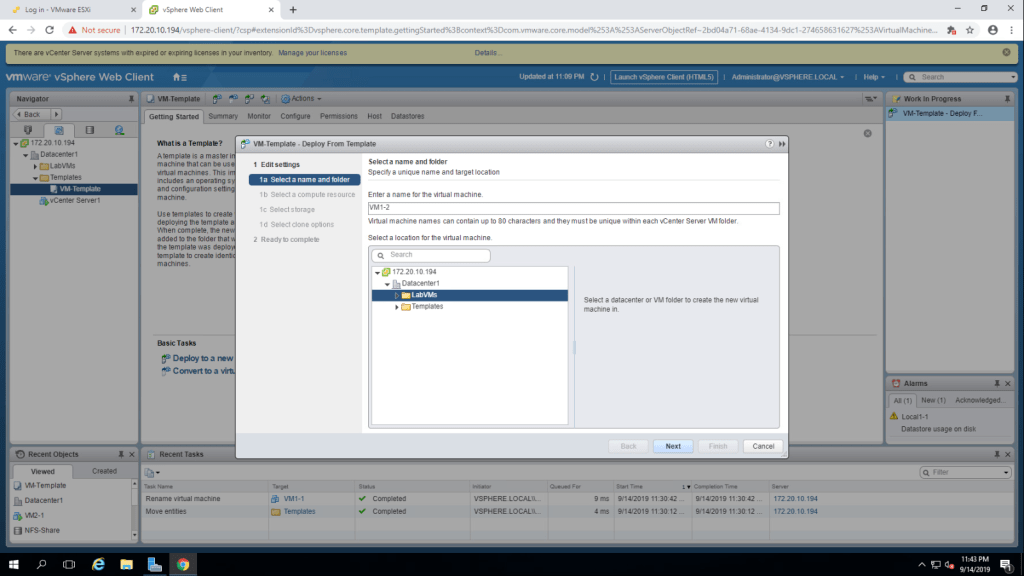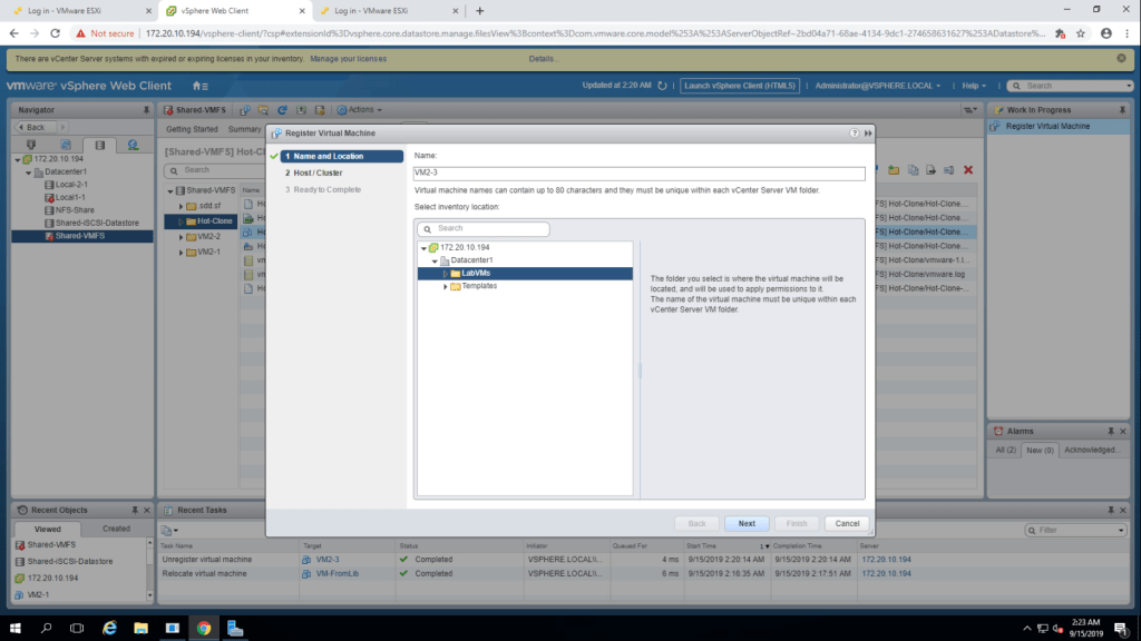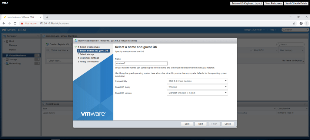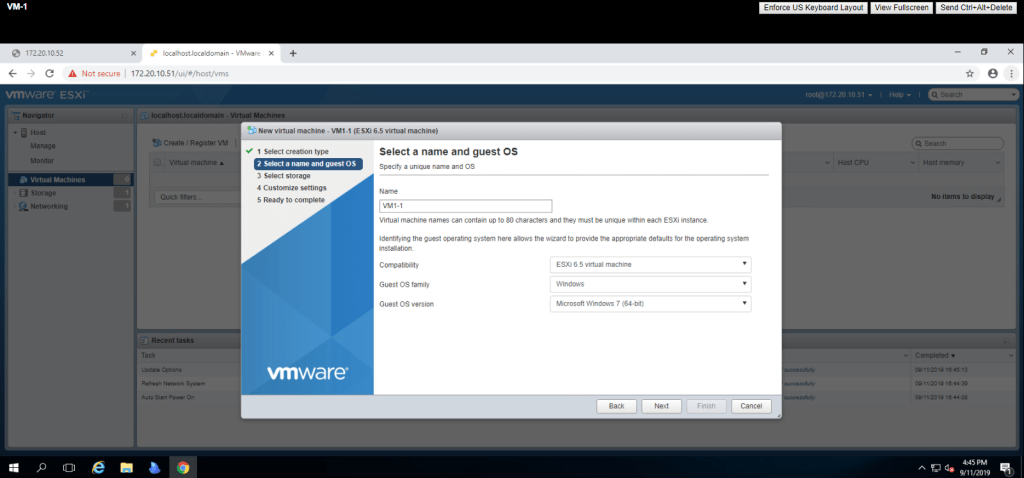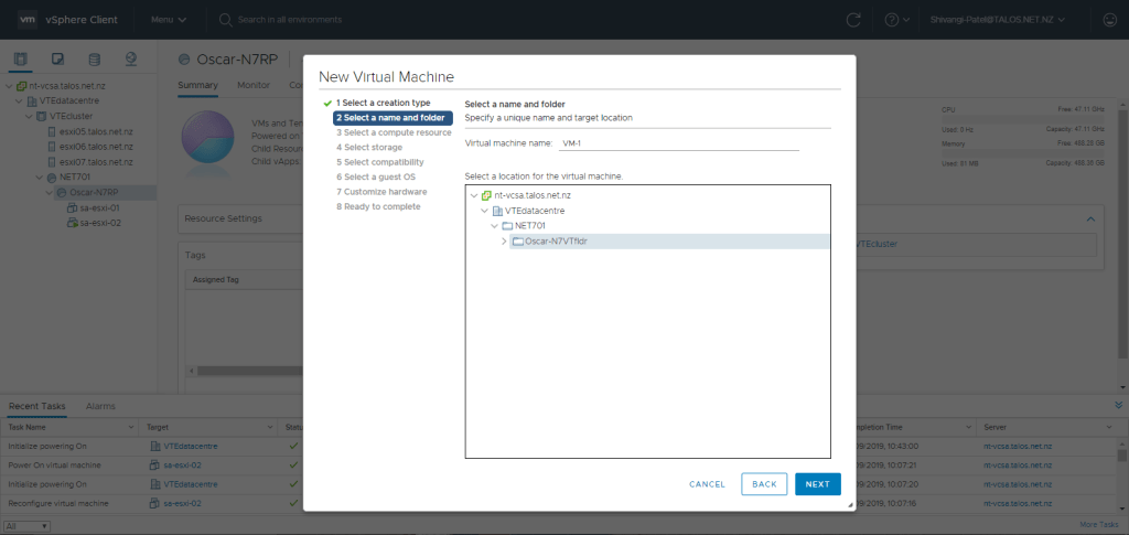 - Right Click on Oscar-N7RP and select Create / Register VM. It will show the New Virtual Machine wizard, click next and then in second step give a name to virtual machine (VM1-1) and select the location. click next.