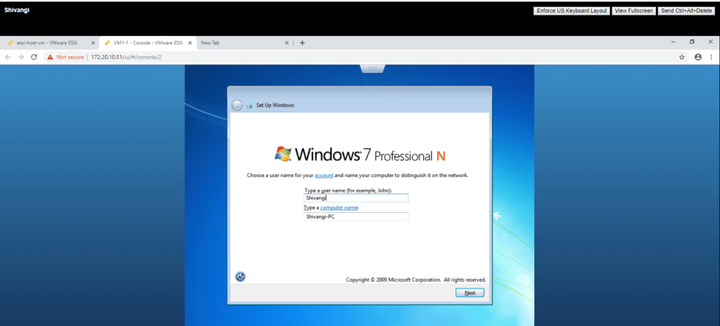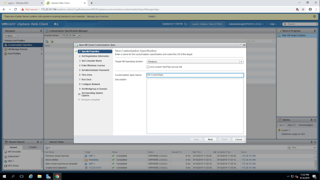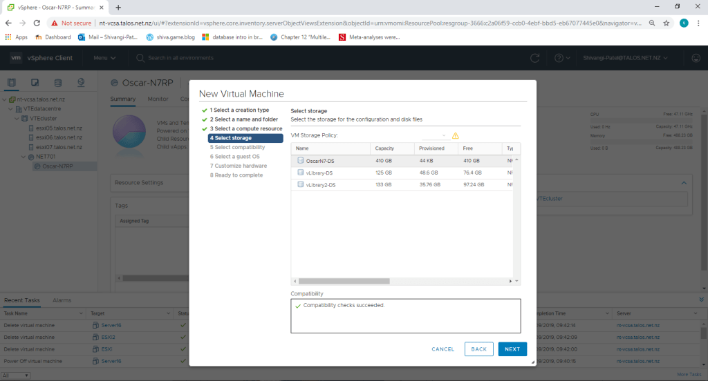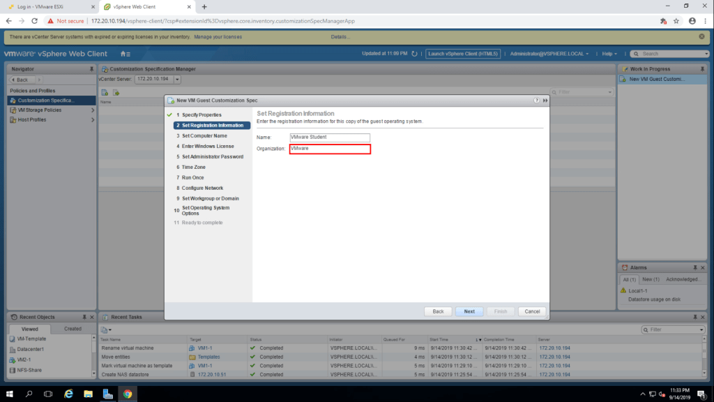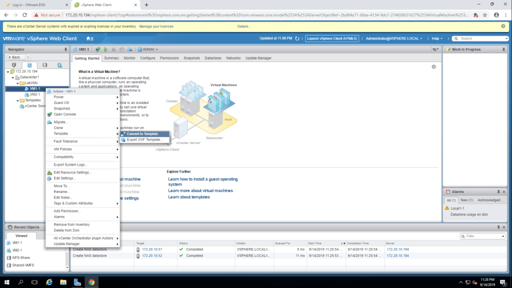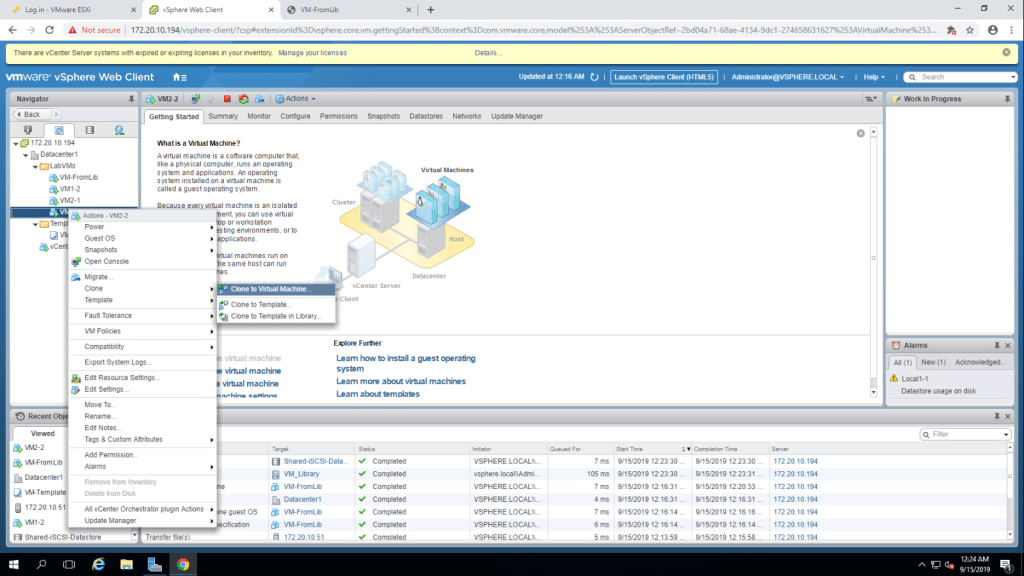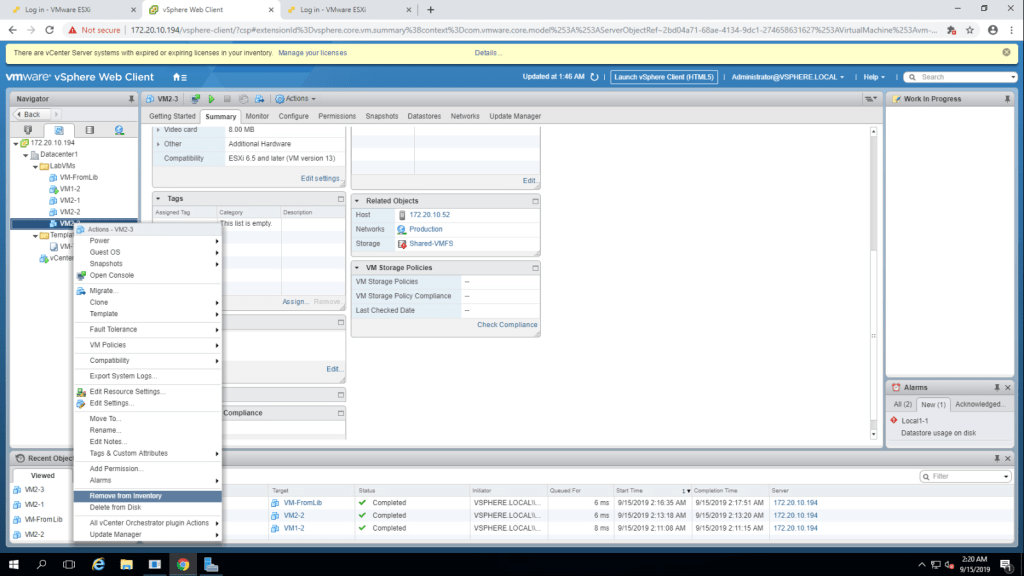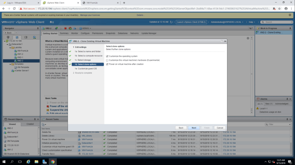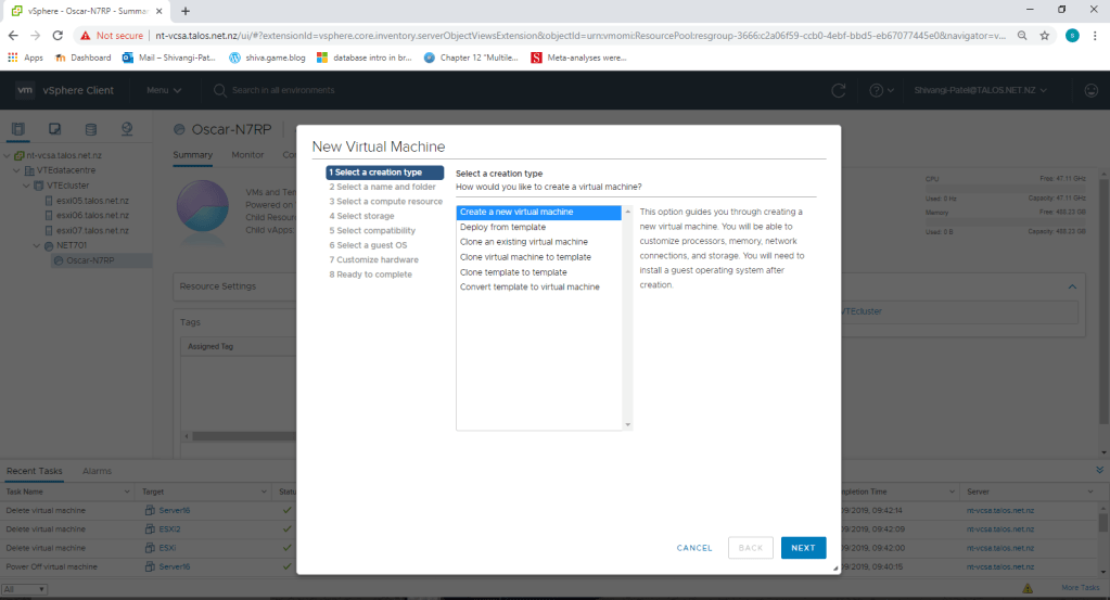 - Right Click on Oscar-N7RP and select Create / Register VM. It will show the New Virtual Machine wizard, click next and then in second step give a name to virtual machine (VM1-1) and select the location. click next.