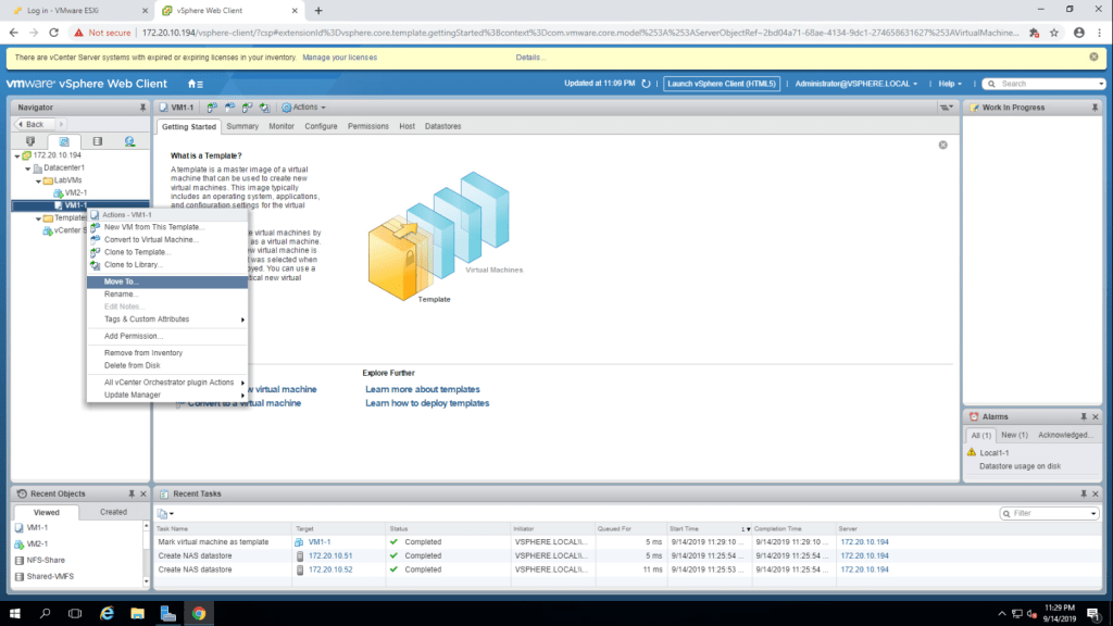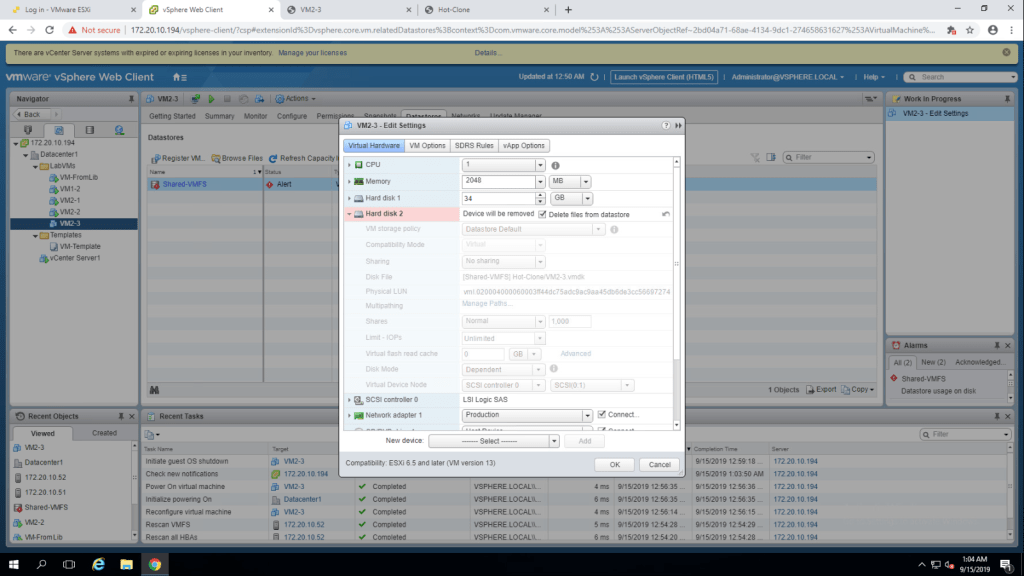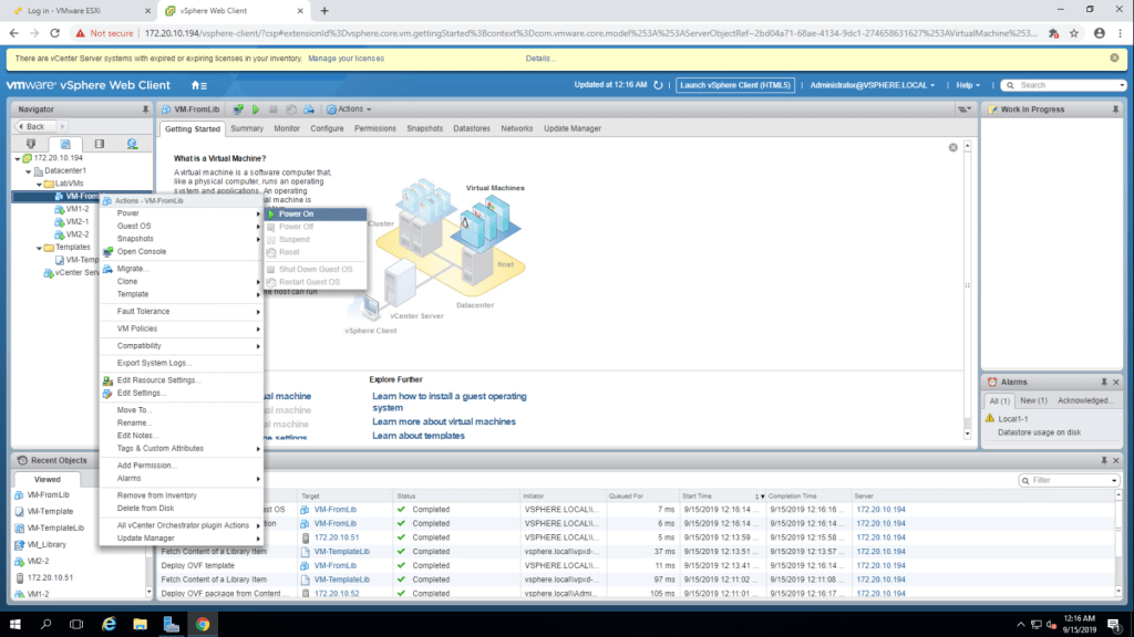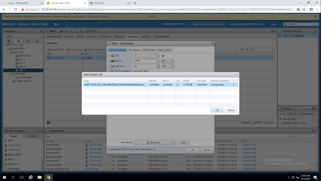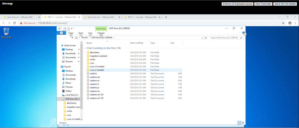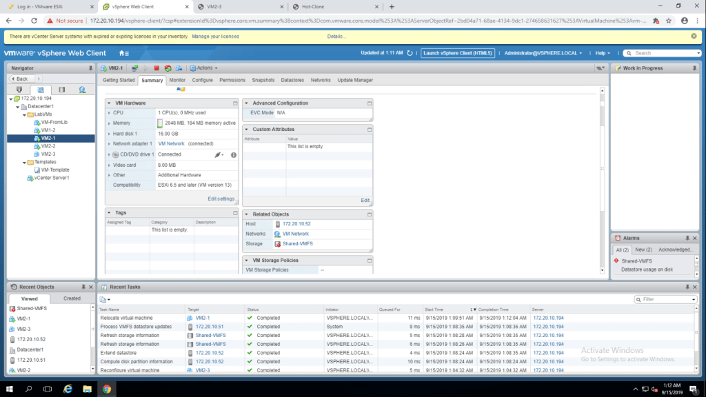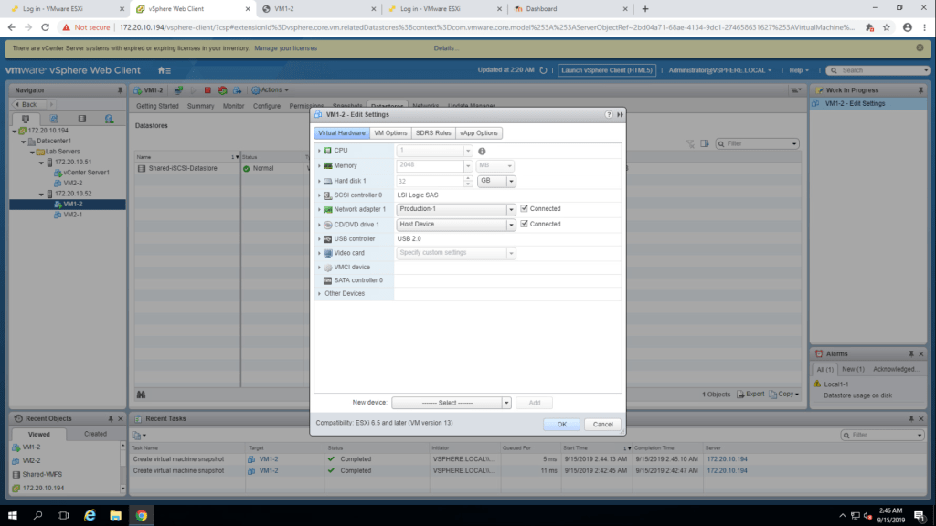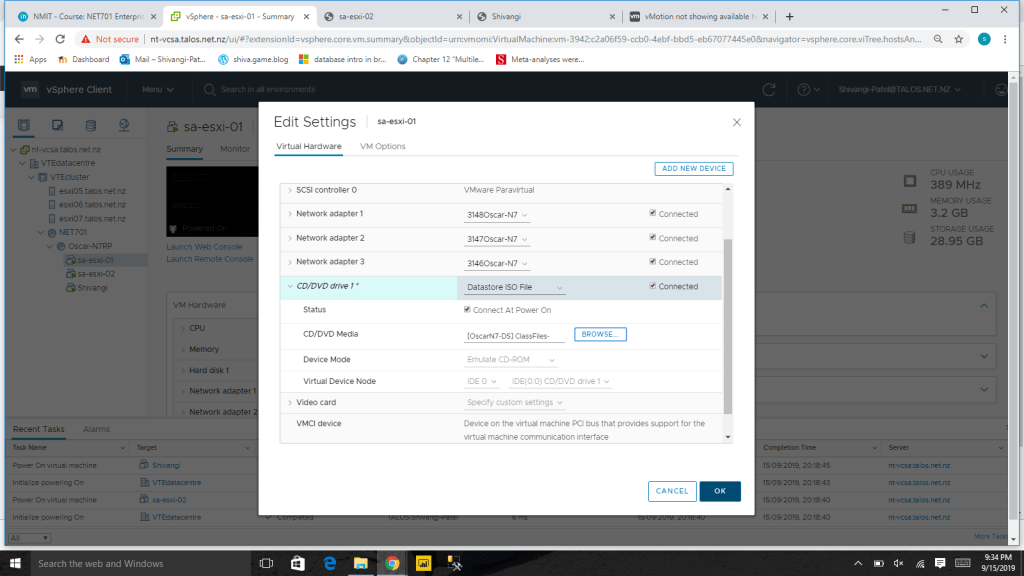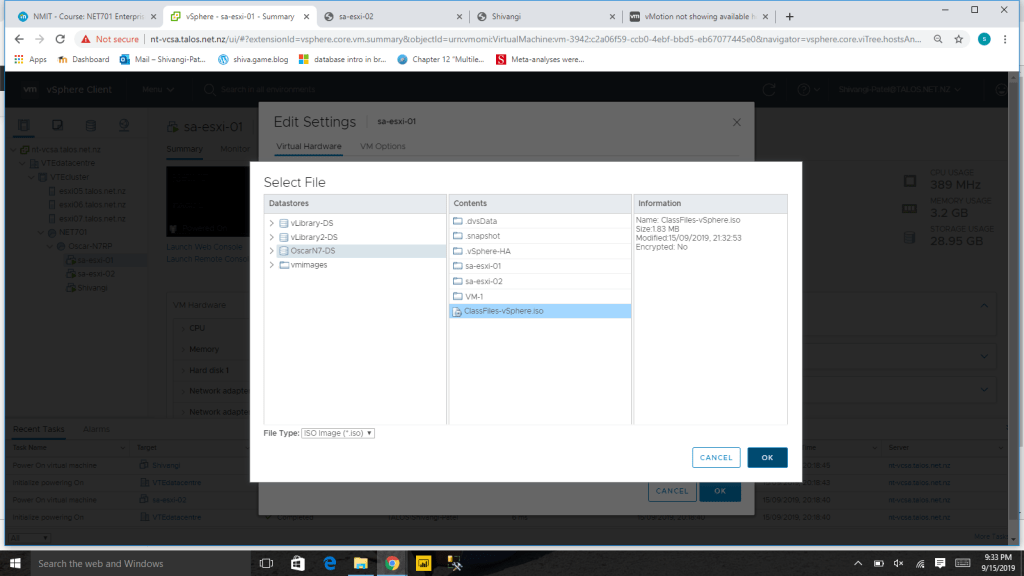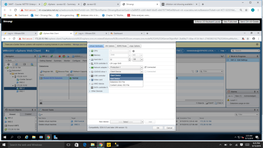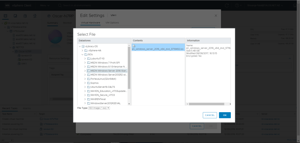 2. Go to Edit settings of VM1-1 and select the appropriate iso file and click ok.then power on the virtual machine and launch console.