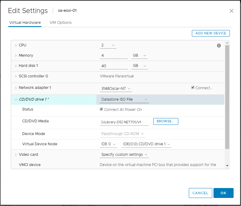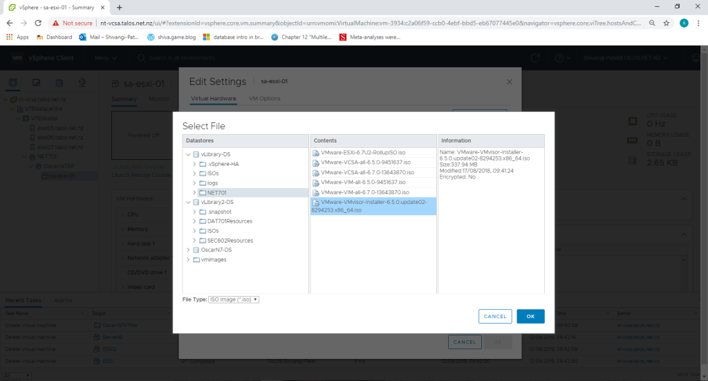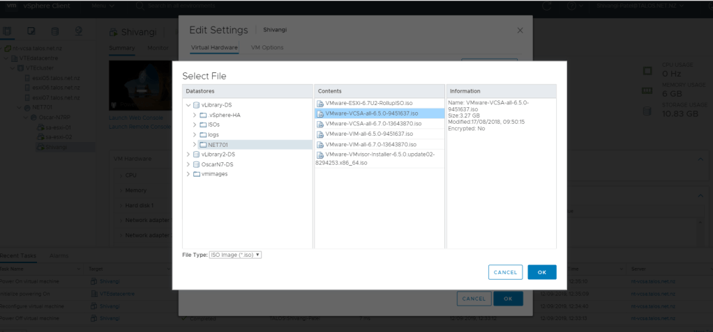 11. Now go to the edit settings of the created virtual machine and from cd/dvd drive select datastore file from the drop down list and then browse the appropriate iso file for that virtual machine.