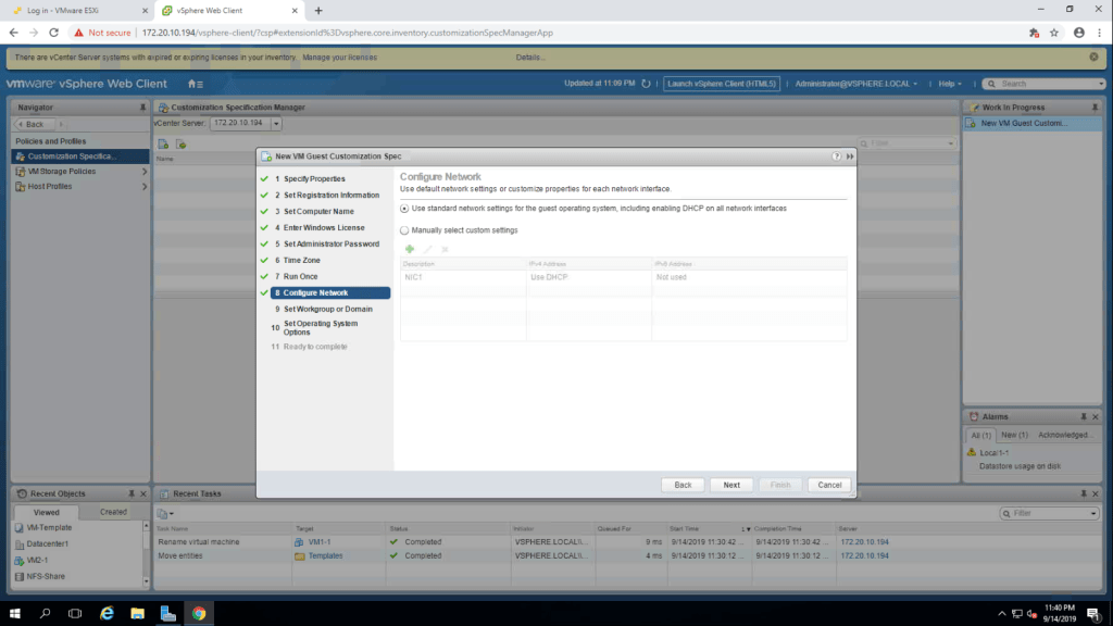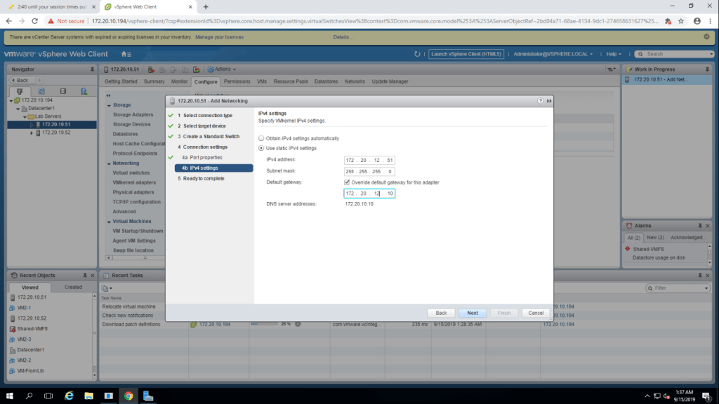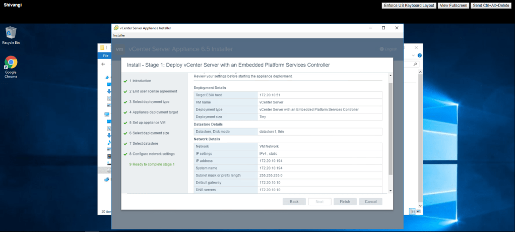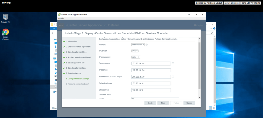 15. Give the IP address of vCenter server 172.20.10.194, Subnet Mask 255.255.255.0, Default Gateway 172.20.10.10 and DNS Server 172.20.10.10 and then next.