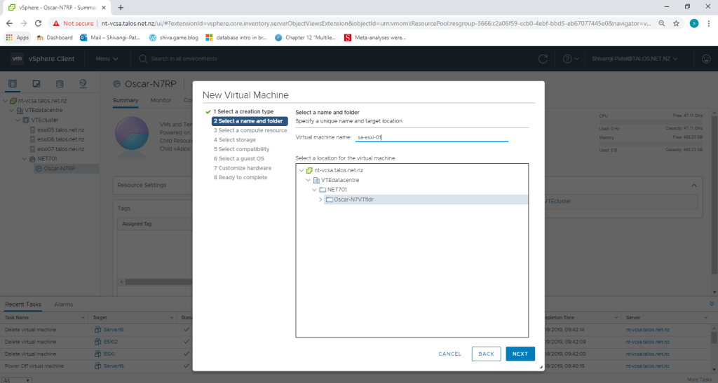 4. Give a name ‘sa-esxi-01’ to virtual machine and select the location. for me the location is Oscar-N7VTfldr. click next.