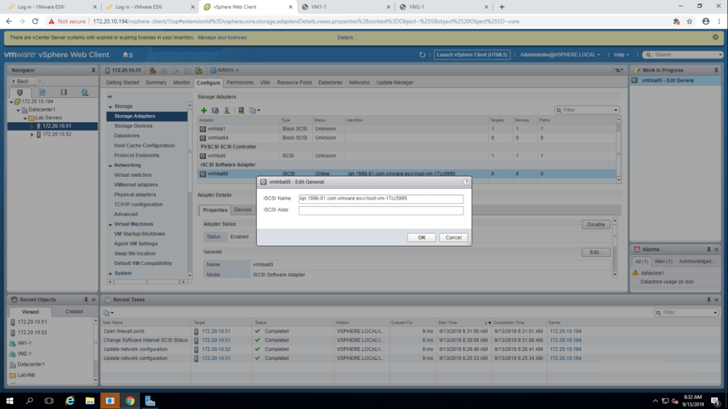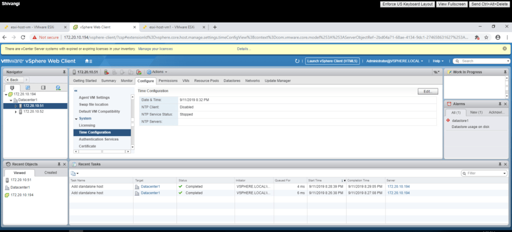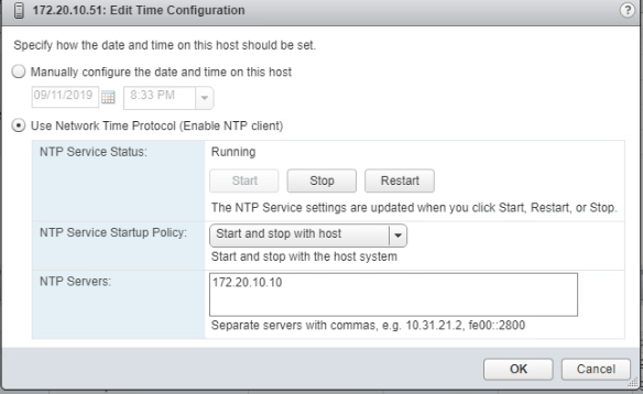- Select 172.20.10.51(first esxi host) and then go to configure tab, then choose Time Configuration and click on edit button.