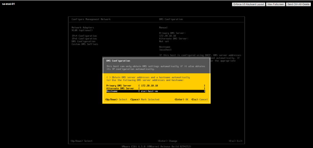 6. Now go to DNS Configuration and in the hostname textbox, type esxi-host-vm and then press enter to save the changes.