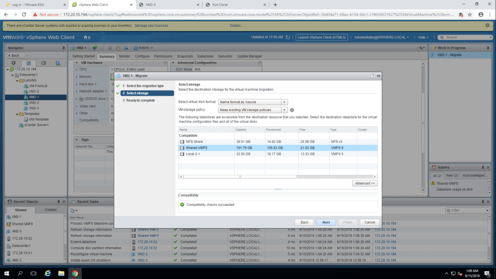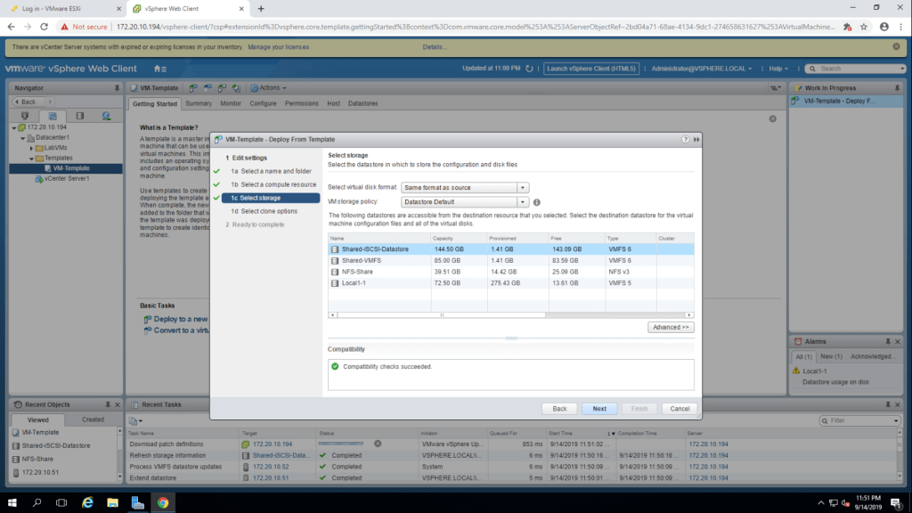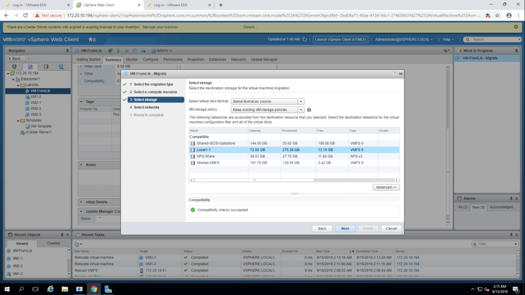 6. Choose a storage for configuration and disk files. It will show the compatibility check succeeded and then click next.
