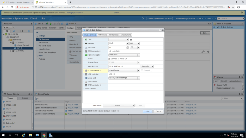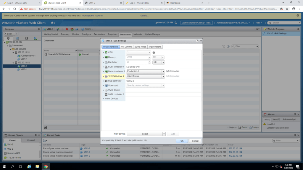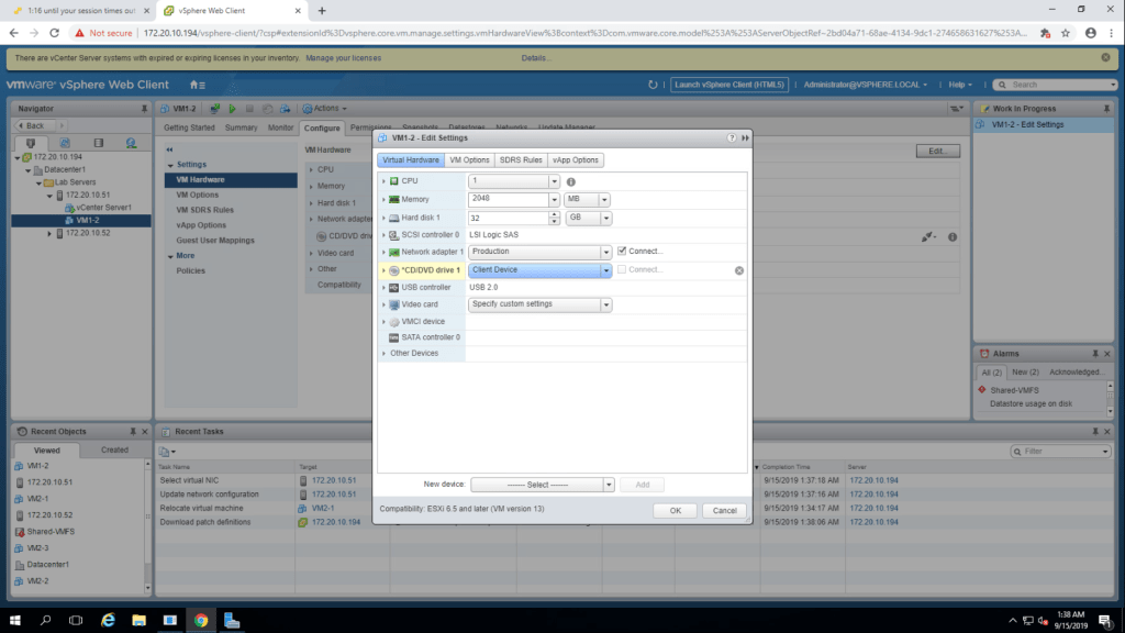 Then Go to edit settings of VM1-2 and select Client Device from the drop down menu of CD/DVD drive1